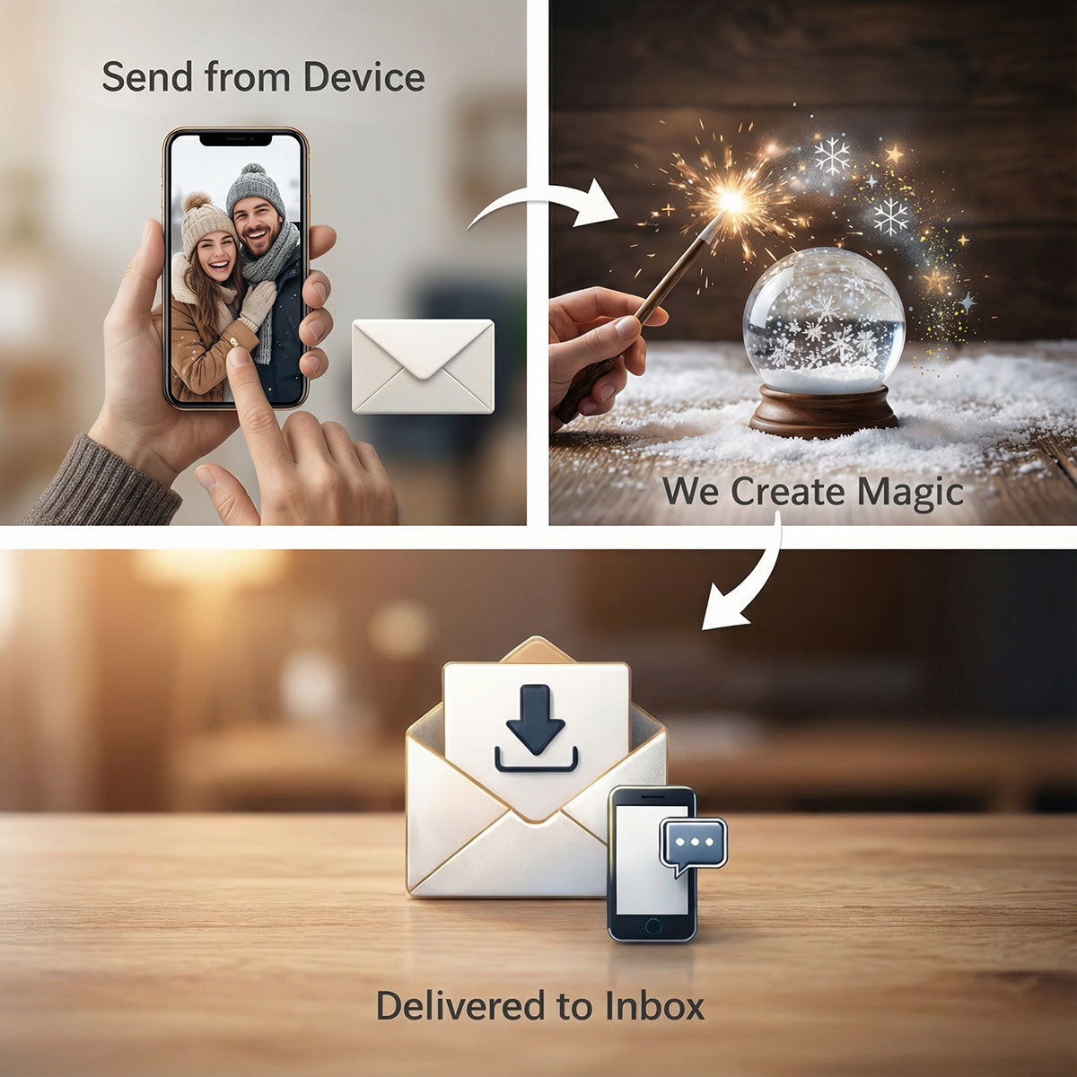 Your snow globe is yours forever. Download it, print it, share it, watch it endlessly. No subscriptions, no expiration.